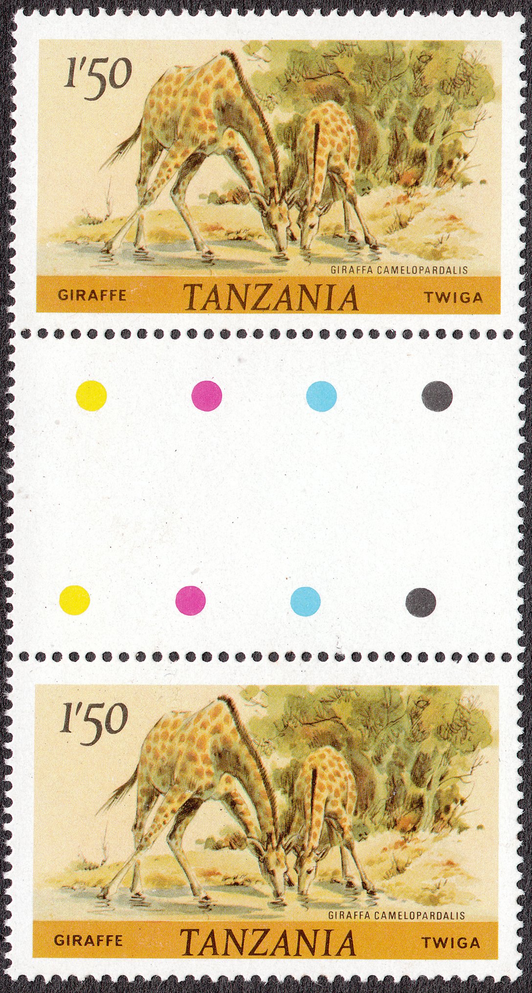 Hier eine Motivmarke mit zwei Wasser trinkenden Giraffen aus Tansania als Zwischenstegpaar = englisch "gutter pair" mit Punkten in den Druckfarben auf dem Zwischensteg: