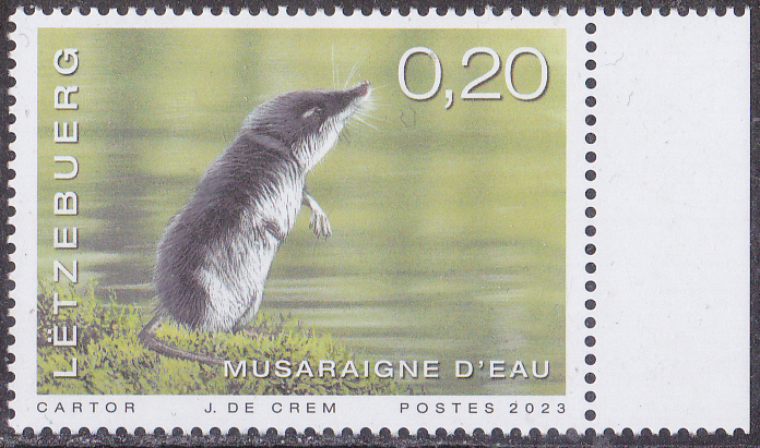 Eine Marke aus Luxemburg (MiNr 2328) bildet eine Wasserspitzmaus (Neomys fodiens) ab.
