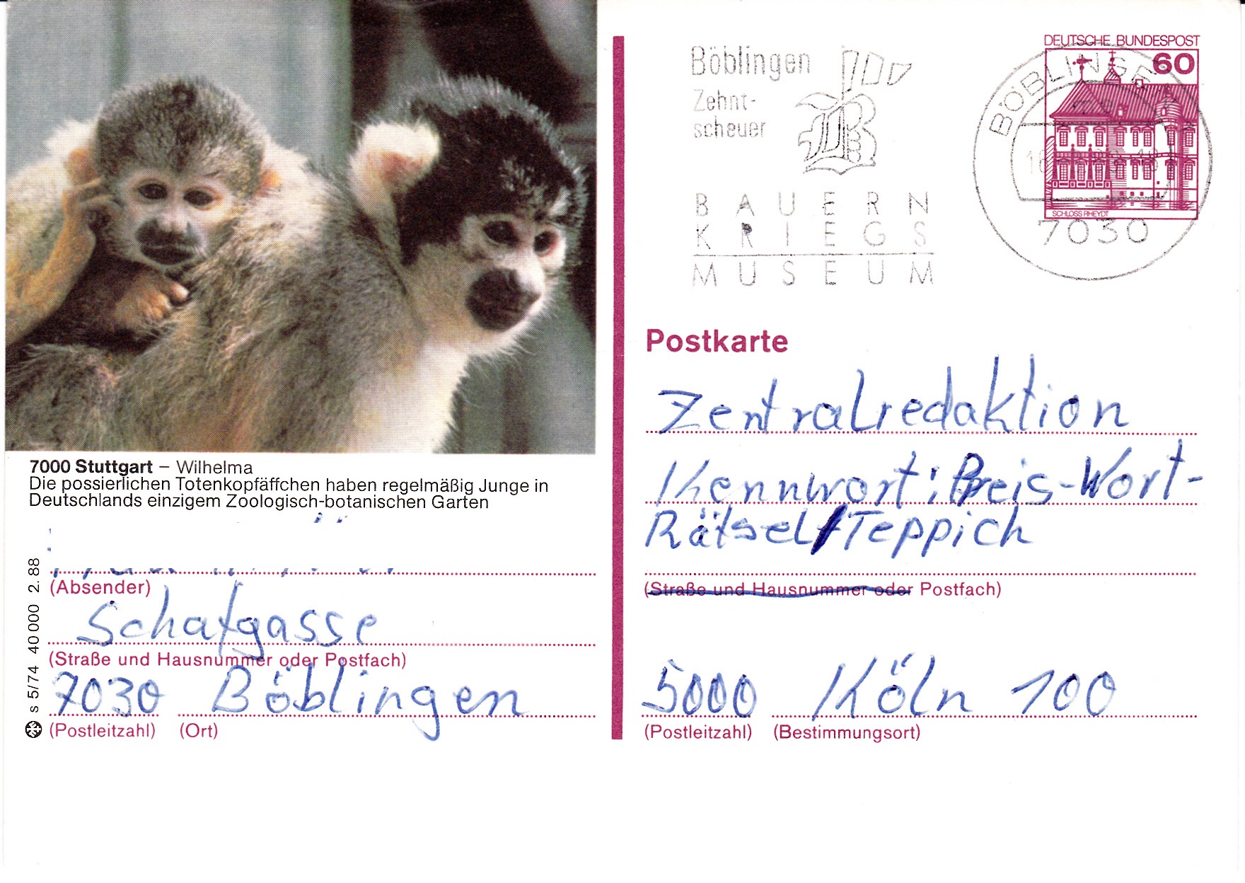 Auf dieser Bildpostkarten der Serie 2.1988 sind Totenkopfaffen aus der Wilhelma in Stuttgart abgebildet.