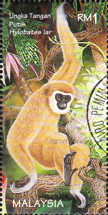 Diese Marke aus Thailand (MiNr 622) bildet einen Lar (Hylobates lar) ab.