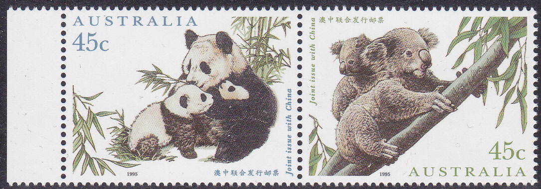 Diese Marke wurde mit einer zweiten Marke mit einem Großen Panda schachbrettartig zusammenhängend gedruckt. Hier ein waagerechtes Paar: