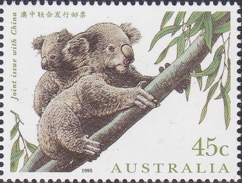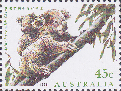 Auf dieser Marke aus Australien (MiNr 1497) ist ein Koala (Phascolarctus cinereus) mit einem Jungtier auf dem Rücken auf einem Ast zu sehen.