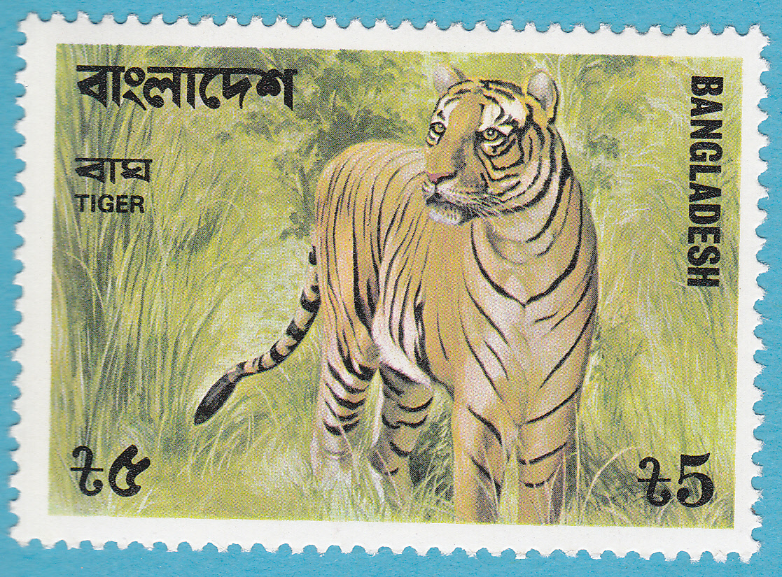 In Bangladesch erschien am 30.4.1973 in einer Dauerserie ein Wert (MiNr 27) mit dem Kopfbild eines Tigers (Panthera tigris), die ich hier abbilde: