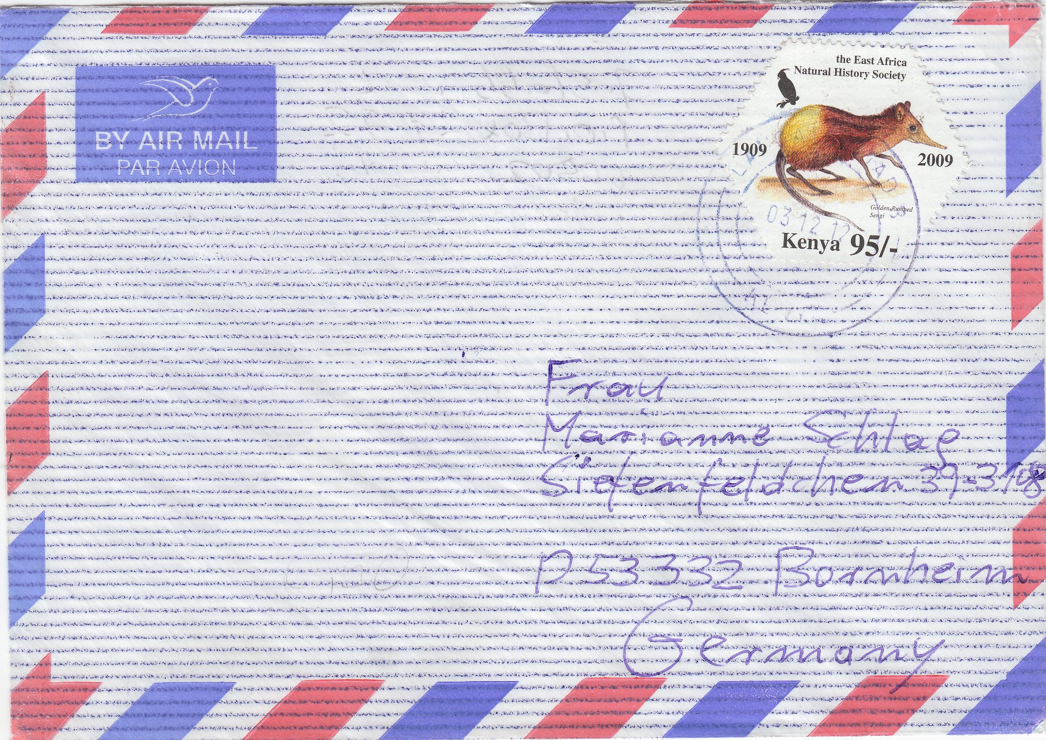 Goldene Rüsselhündchen kommen ausschließlich in dem an der Südostküste Kenias gelegenen Arabuko-Sokoke-Nationalpark vor. Hier ein Brief aus Kenia mit einer Einzelfrankatur einer sechseckigen Briefmarke, die ein solches Tier zeigt: