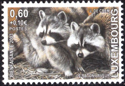 Auf dieser Marke aus Luxemburg aus dem Jahre 2003 (MiNr 1623) sehen wir zwei Waschbären (Procyon lotor).
