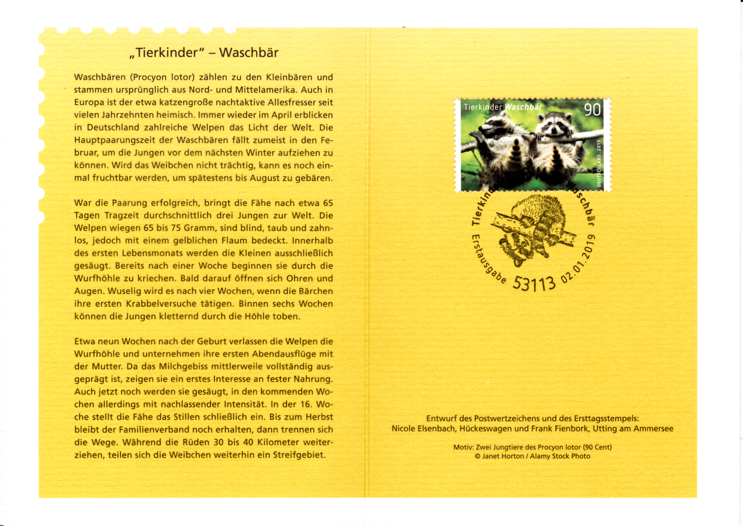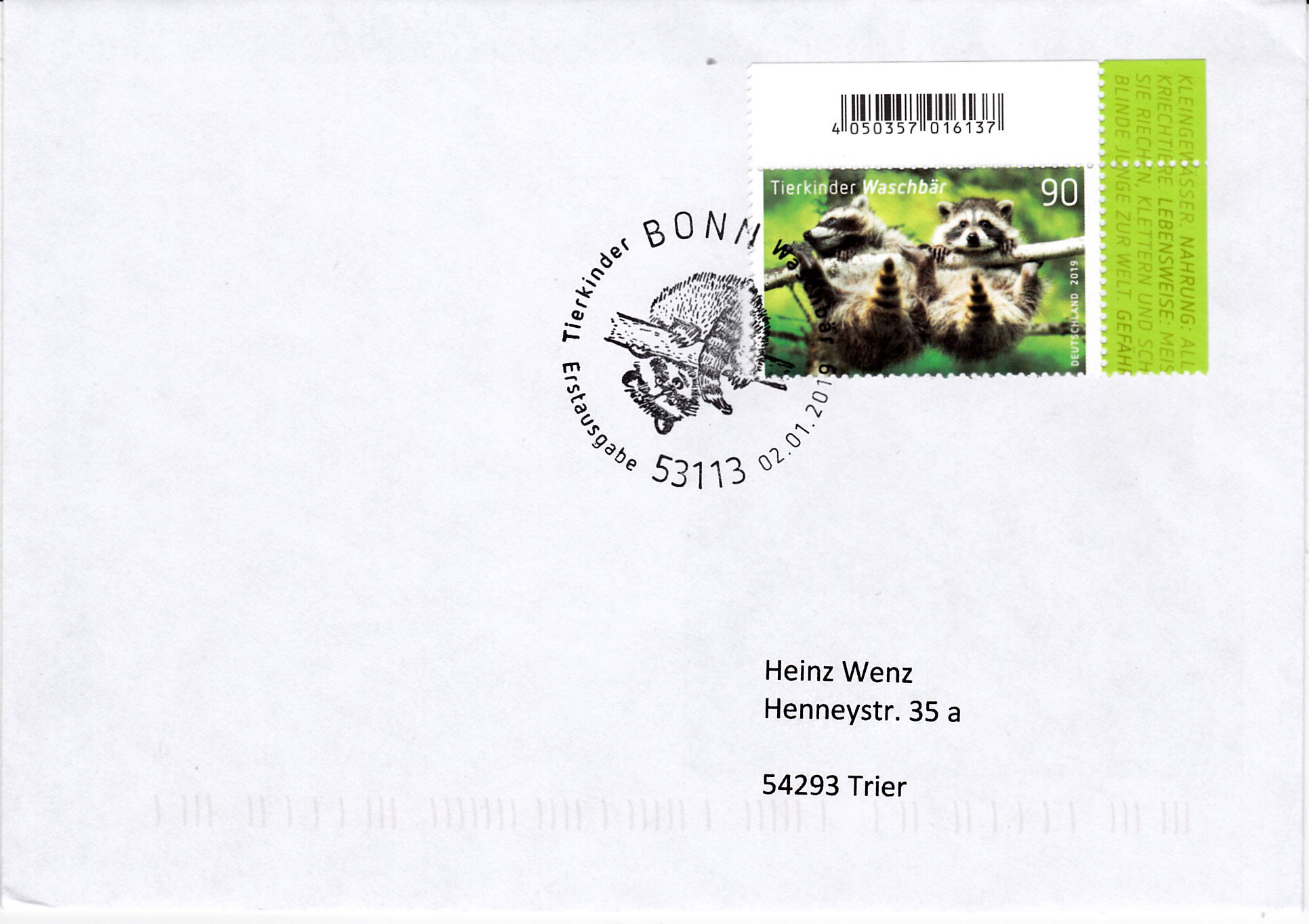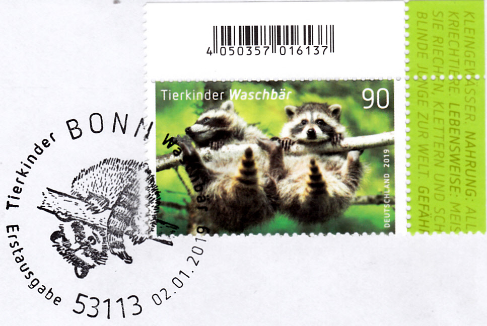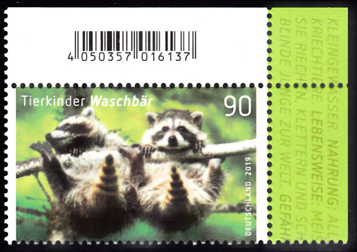 Bei der Deutschen Post ist in der Serie "Tierbabys" eine Marke mit zwei Waschbärkinder (Procyon lotor) erschienen. Hier eine Marke vom Eckrand mit RAN-Codierung.