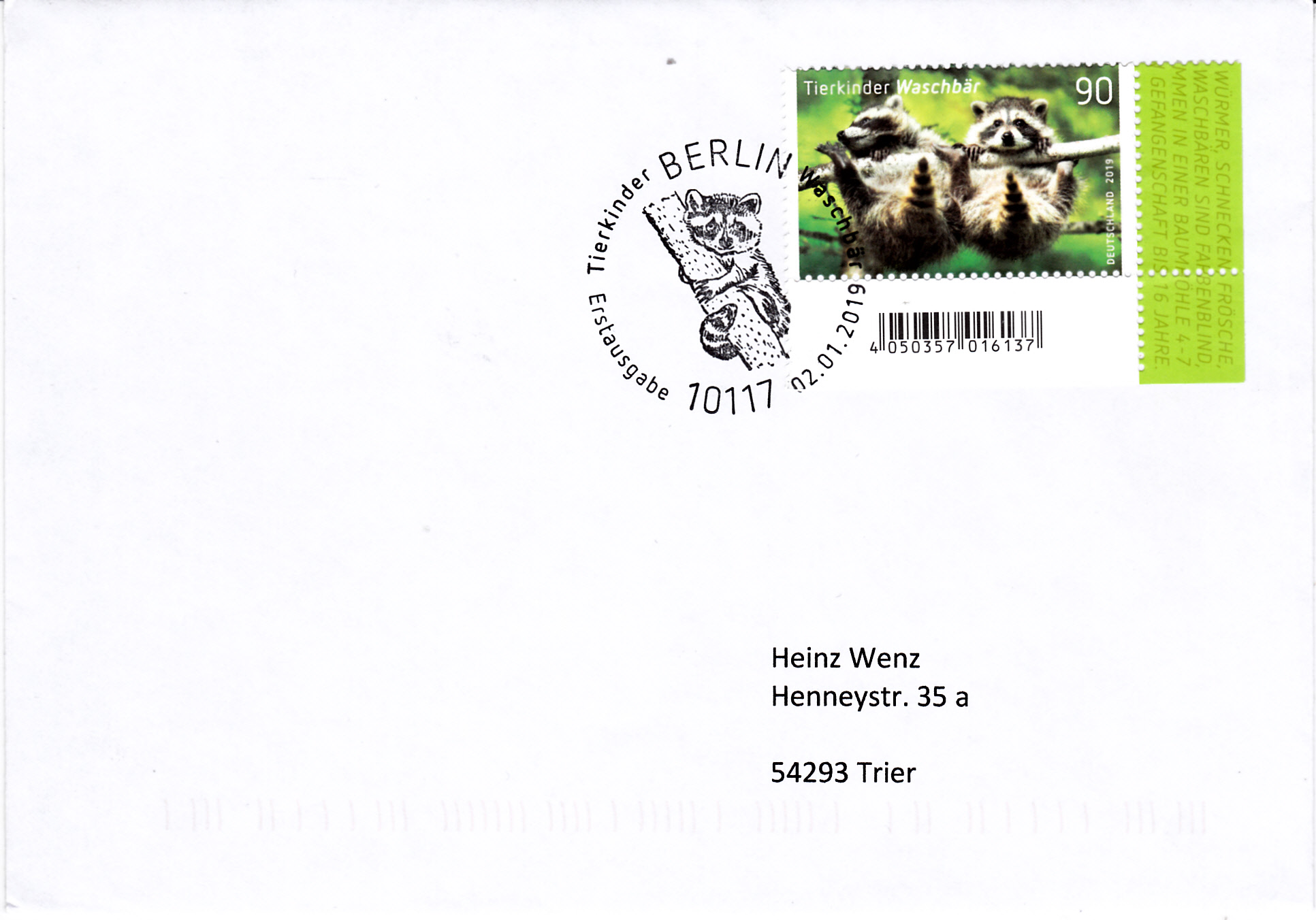 Es folgt ein Brief mit dem Ersttagsonderstempel Berlin. Bei beiden Erstagsonderstempel sind auch im Stempelbild Waschbären abgebildet.