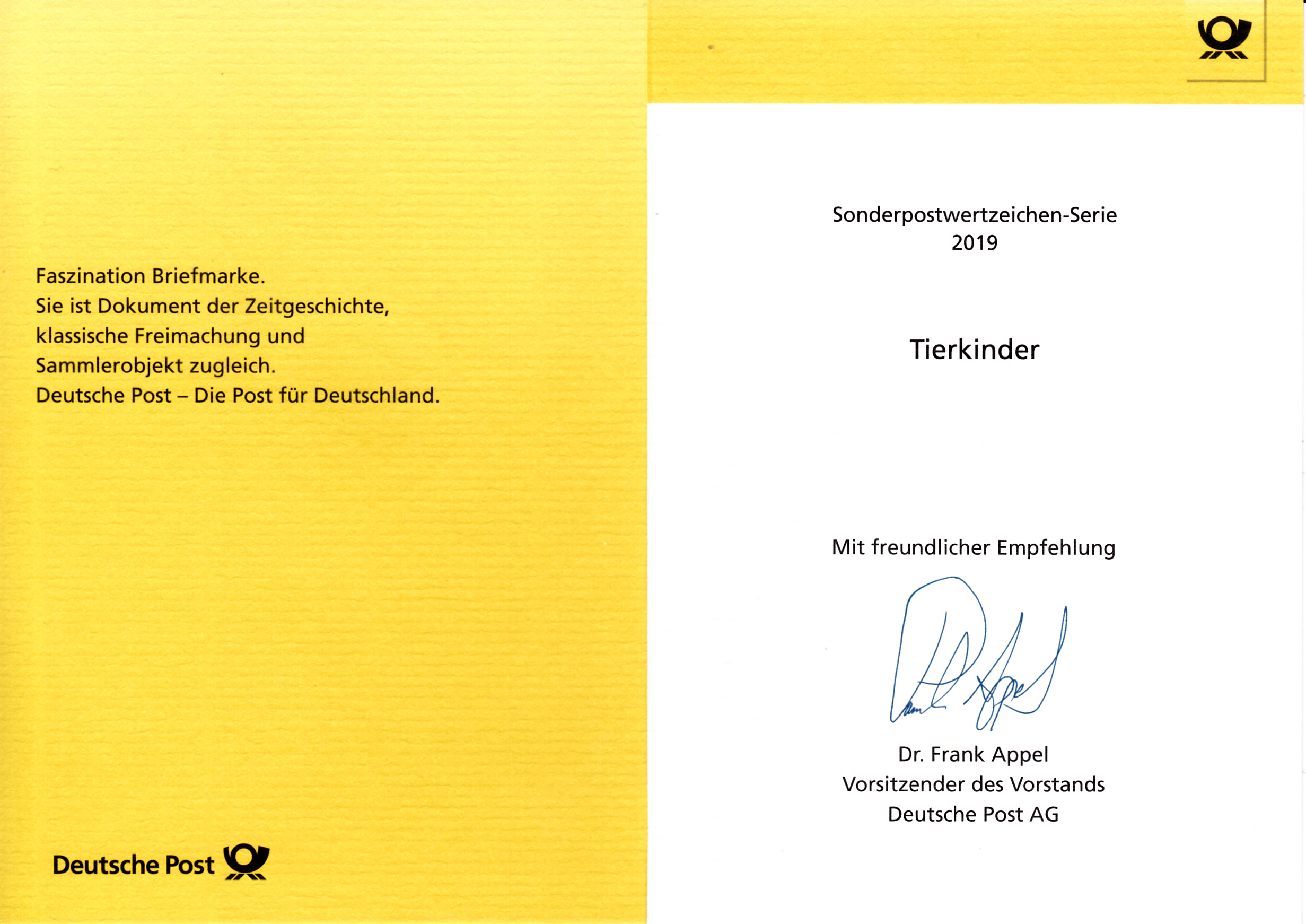 Klappkarte des Vorstandsvorsitzenden der Deutschen Post AG mit einer Marke (MiNr 3434) aus der Serie "Tierbabys" mit dem Motiv "Waschbär (Procyon lotor)" und mit dem Ersttagsonderstempel Bonn.