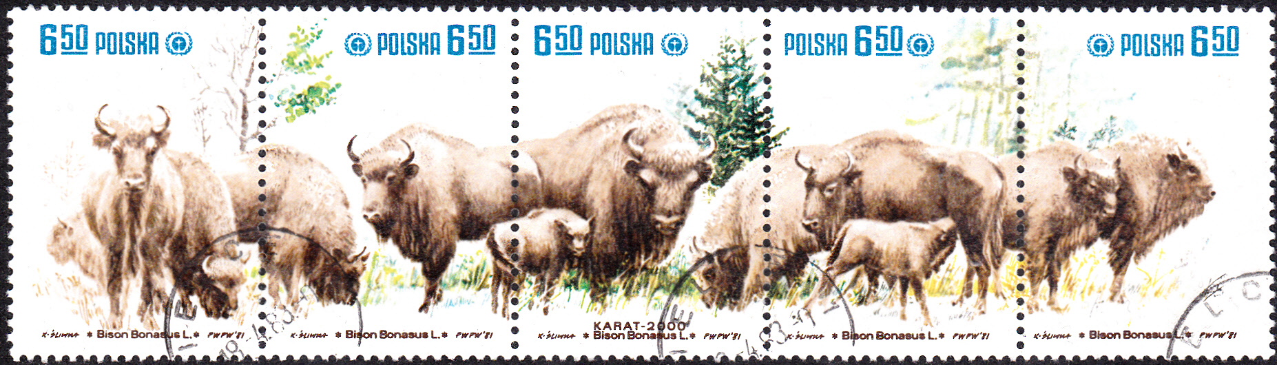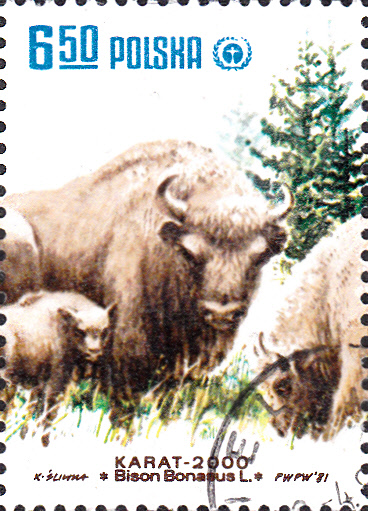 1981 erschienen in Polen in einer Serie "Naturschutz" weitere Marken mit Wisenten (Bison bonasus). Auf dieser Marke (MiNr 2764) sehen wir einen Wisent aufrecht stehend von vorne und einen beim Grasen.