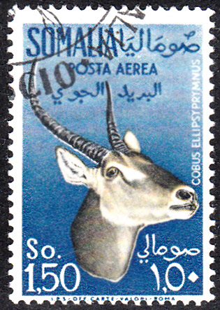 Diese Marke aus Italienisch-Somaliland (MiNr 311) zeigt den Kopf eines Ellipsen-Wasserbock (Kobus ellipsiprymnus).