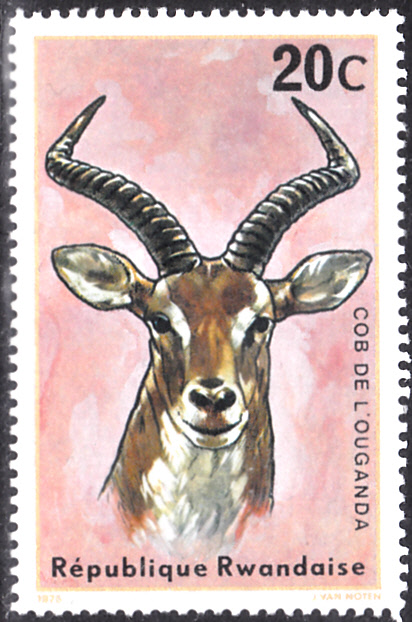 Auf dieser Marke aus Ruanda (MiNr 673) wird der Kopf einer Uganda-Grasantilope (Kobus thomasi) gezeigt.