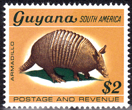 Hier eine Marke aus Guyana (MiNr 314) mit einem Neunbinden-Gürteltier (Dasypus novemcinctus).