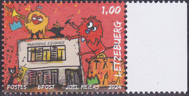 In Luxemburg erschien am 10.9.2024 zu einer Veranstaltung zum Tag der Briefmarken 2024 in Steinsel eine Marke (MiNr 2374) mit der Abbildung des Gebäudes "Musekshaus A Schmatts" in Steinsel nach einer Zeichnung von Joël Meiers (geb.1973, Künstler).