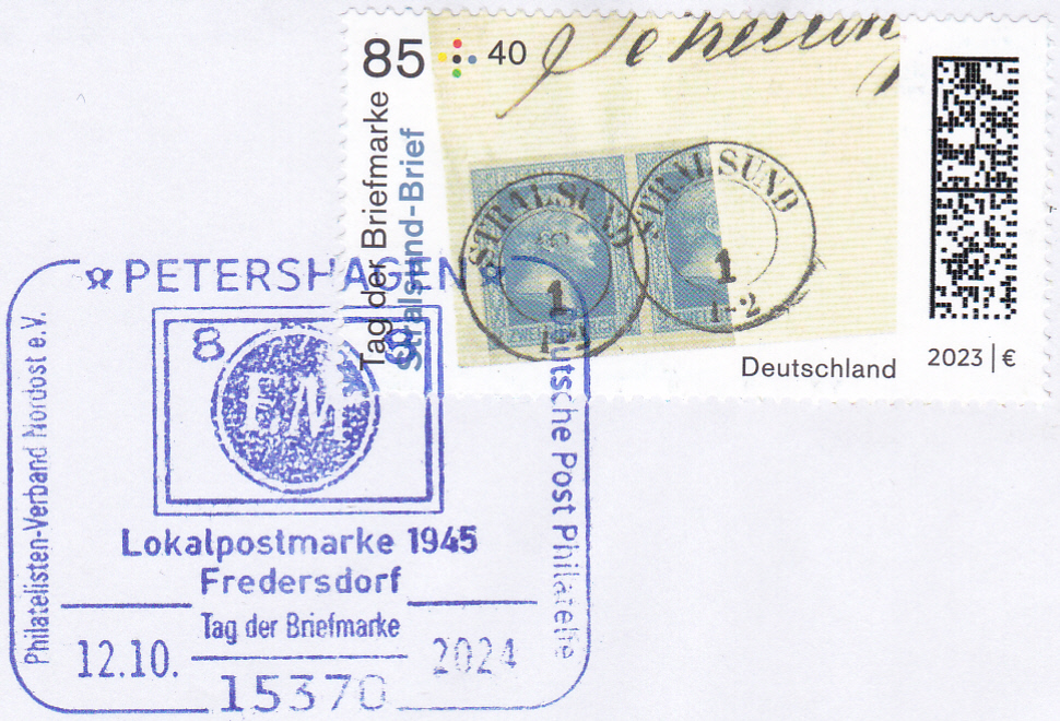 Sonderstempel vom 12.10.2024 aus Petershagen zum Tag der Briefmarke 2024 des Philatelisten-Verbands Nordost e.V. mit der Abbildung einer Lokalpostmarke aus Fredersdorf.