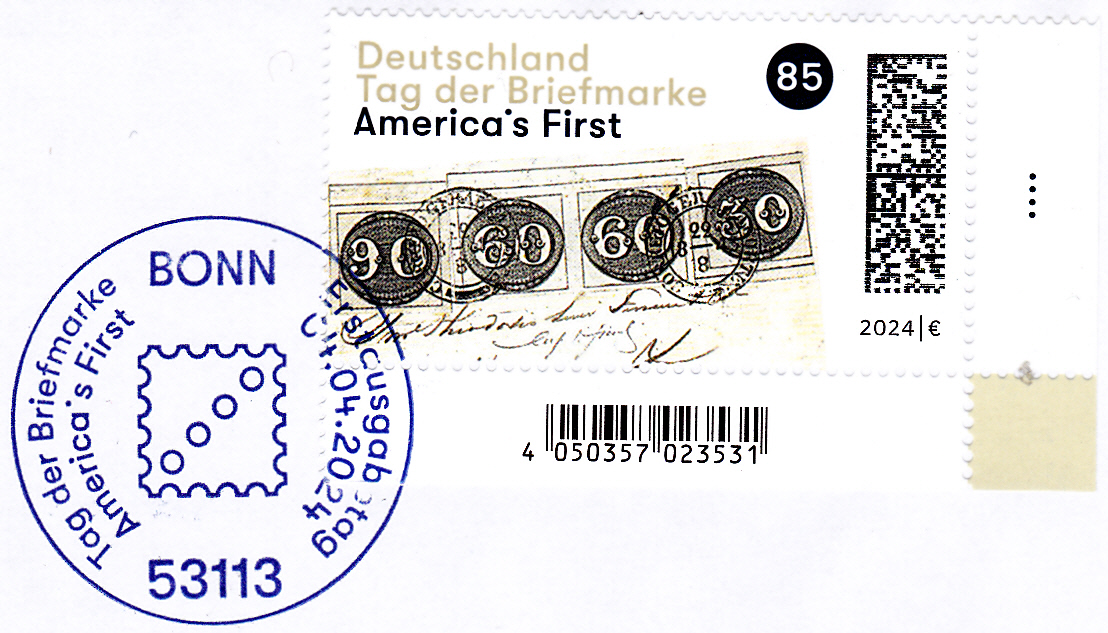 Am 4. April 2024 erschien bei der Deutschen Post eine Marke (MiNr 3822) zum Tag der Briefmarke 2024. Als Motiv wurden die Freimarken Brasilien MiNr. 1 bis 3 "Ochsenaugen" vom 1. August 1843 gewählt. Dies waren die ersten Postwertzeichen Amerikas. Hier zeige ich eine Marke vom Eckrand mit EAN-Codierung.