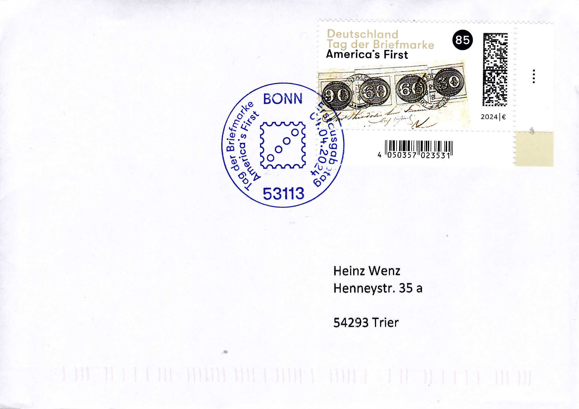 Brief vom Ersttag mit der Marke zum Tag der Briefmarke 2024 (MiNr 3822) und dem Ersttagsonderstempel aus Bonn.
