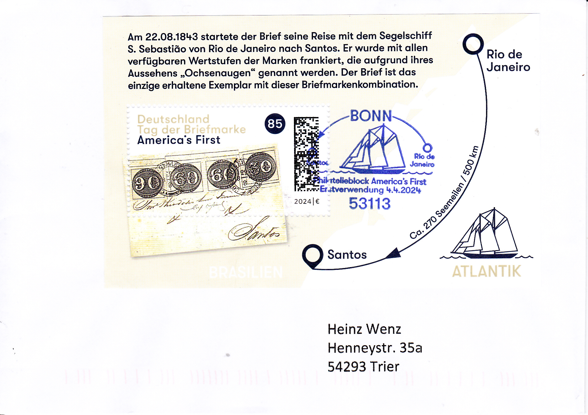 Die Marke zum Tag der Briefmarke 2024 wurde auch in einem Block (MiNr Block 93) gedruckt. Auf dem Blockrand werden ein weiterer Teil des Briefes aus der Sammlung Luis Alemanys mit Brasilien MiNr. 1 bis 3, gelaufen von Rio de Janeiro nach Santos, ein Beschreibungstext und eine Skizze des Seeweges sowie ein Segelschiff gezeigt.