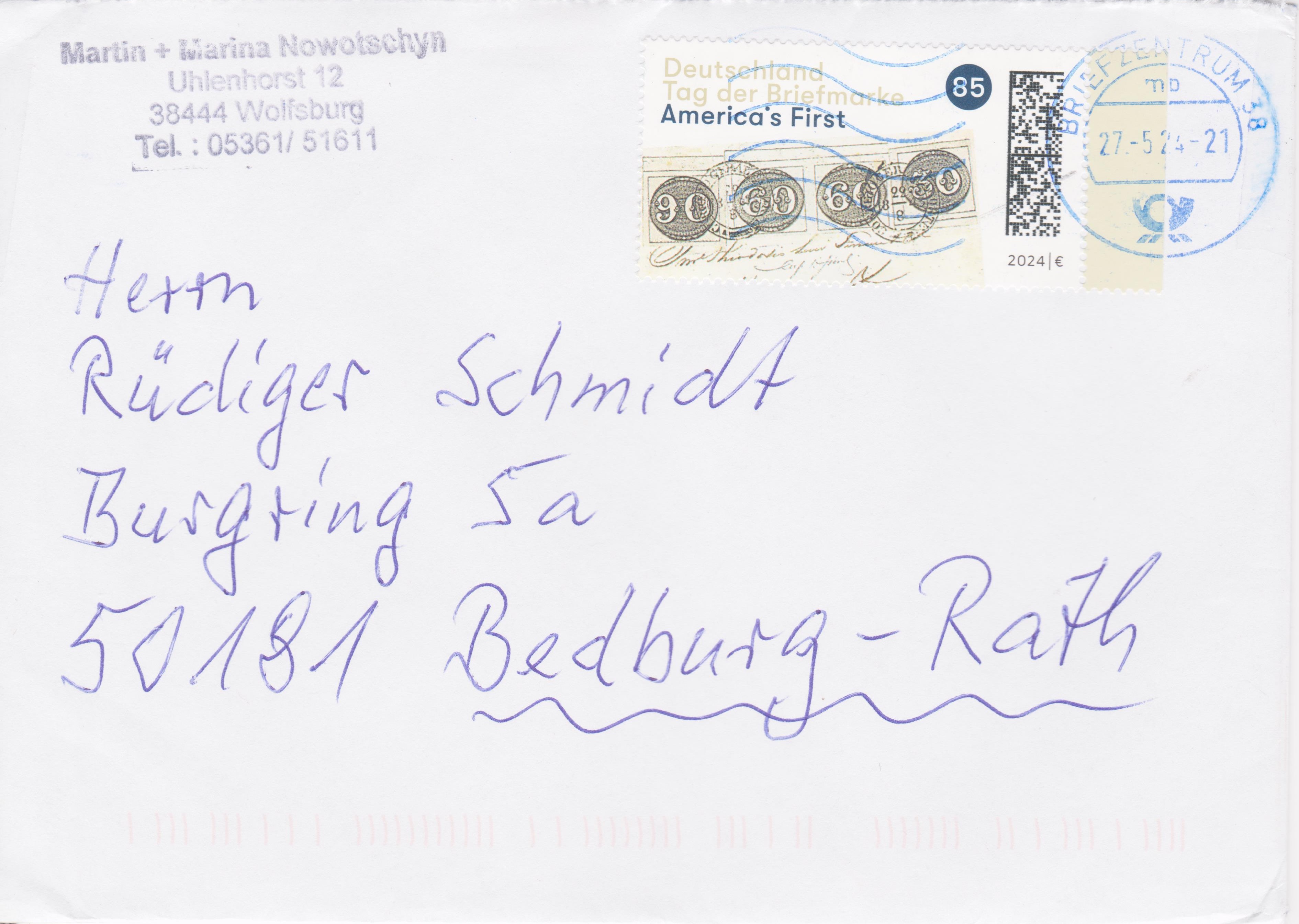 Bedarfsbrief mit einer Einzelfrankatur der Marke zum Tag der Briefmarke 2024, MiNr. 3822, mit Maschinenstempel BRIEFZENTRUM 38 vom 27.05.2024: