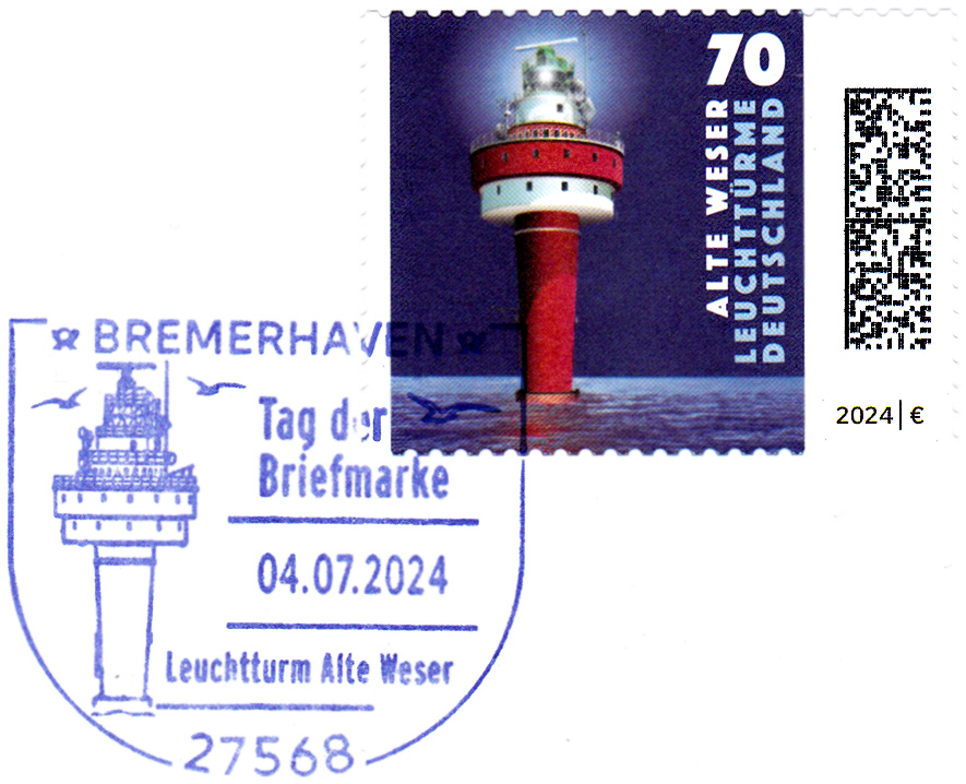 Sonderstempel vom 4.7.2024 aus Bremerhaven zum Tag der Briefmarke 2024 mit dem Leuchtturm "Alte Weser" und der am gleichen Tag verausgabten selbstklebenden Marke der Deutschen Post mit dem gleichen Motiv.