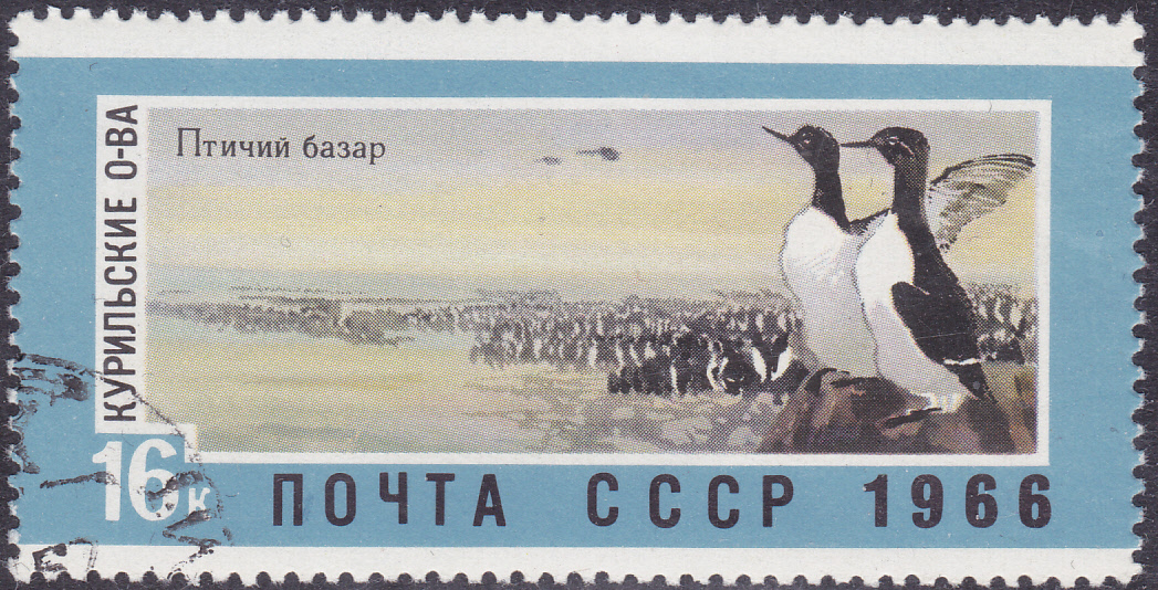 Die Marke aus der Sowjetunion (MiNr 3310) zeigt eine Trottellummenkolonie (Uria aalge) auf den Kurilen.