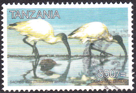 Aus Tansania kommt diese Marke (MiNr 2791), die zwei Heilige Ibisse zeigt.