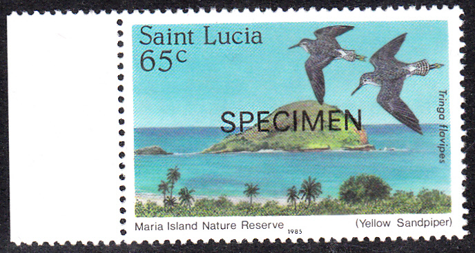 In einer Serie "Naturschutz" aus St. Lucia ist eine Marke (MiNr 773) mit zwei Kleinen Gelbschenkel (Tringa flavipes) im Flug erschienen. Hier zeige ich eine Mustermarke.