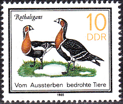 In einer Serie "Geschützte Vögel" erschien in der Sowjetunion diese Marke (MiNr 2689) mit zwei fliegenden Rothalsgänse (Branta ruficollis).