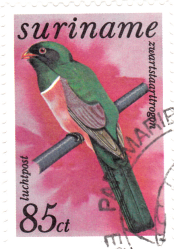 Auf dieser Ganzsache aus der Ciskei (vom 4.12.1981 bis 27.4.1994 von Südafrika unabhängiges Homeland) wird auf dem seitlichen Bild ein Narinatrogonpärchen (Apaloderma narina) gezeigt. Dieses Motiv gibt es auch als Markenmotiv (Ciskei MiNr 20). Der Wertstempel zeigt einen Schwarzkopfpirol (Oriolus larvatus).
