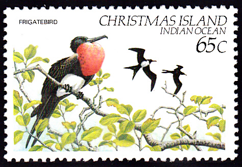 Diese Marke der Weihnachtsinsel (MiNr 164) zeigt ein Männchen der Unterart Weihnachtsinseln-Bindenfregattvogel (Fregata minor minor) auf einem Ast sitzend und zwei fliegende Vögel dieser Art.