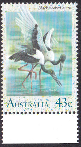 Auf dieser Marke aus Australien (MiNr 1238) werden Schwarzhalsstörche (Ephippiorhynchus asiaticus) vorgestellt.