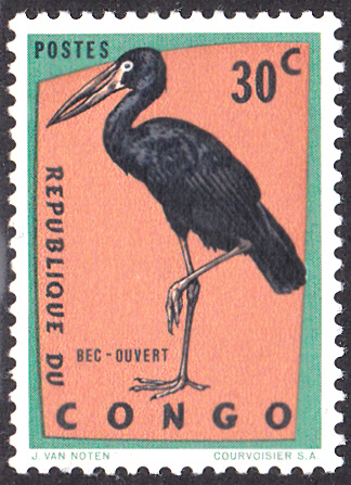Hier zeige ich eine Marke (MiNr 140) aus dem Kongo (Kinshasa) mit einem Mohrenklaffschnabel (Anastomus lamelligerus).