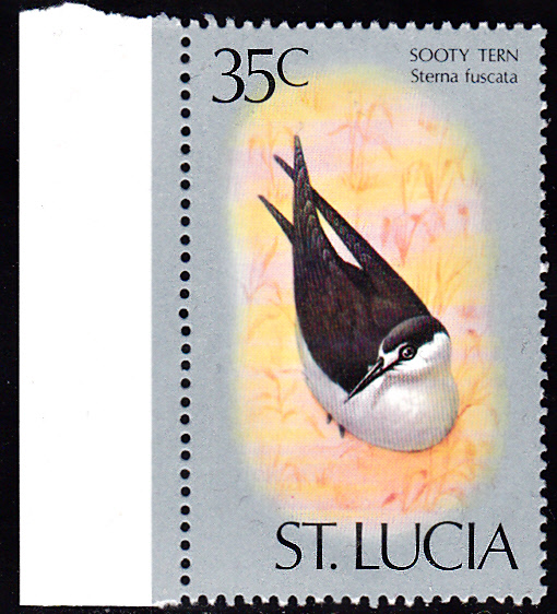 Auf dieser Marke aus St. Lucia (MiNr 390) mit einer Rußseeschwalbe (Onychoprion fuscatus) und im Michel wird noch der Name mit Rußseeschwalbe (Sterna fuscuta) angegeben.