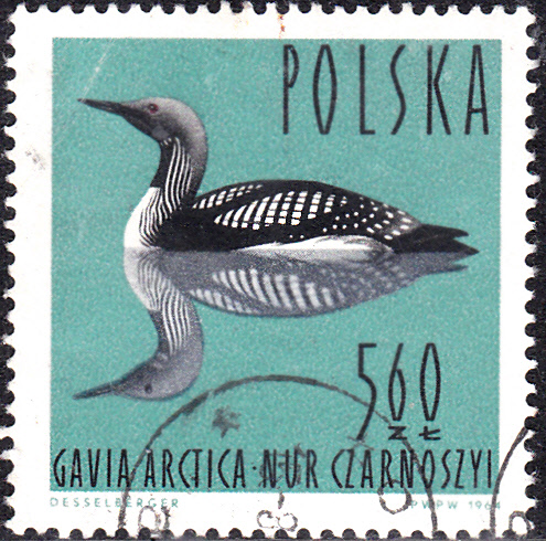 Auf einer polnischen Marke (MiNr 1497) wird ein Prachttaucher (Gavia arctica) gezeigt.