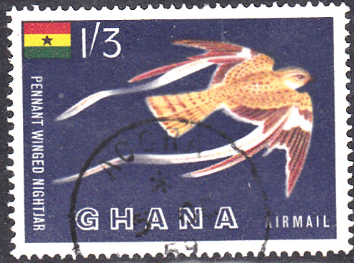 Diese Marke aus Ghana (MiNr 61) stellt uns ein Männchen der Fahnennachtschwalbe (Macrodi-pteryx longipennis) vor.