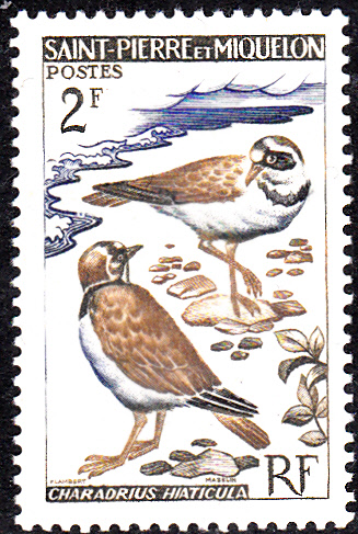 Auf dieser Marke aus St. Pierre und Miquelon (MiNr 400) sehen wir zwei Sandregenpfeifer (Charadrius hiaticula).