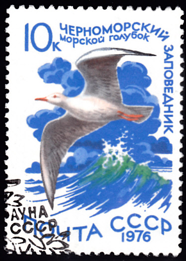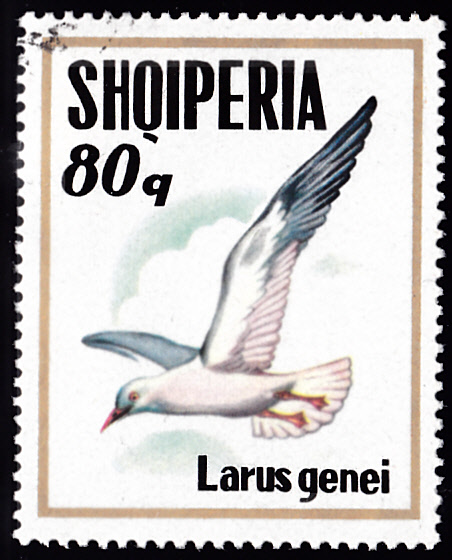 Aus Albanien kommt diese Marke (MiNr 1624) mit einer Dünnschnabelmöwe (Chroicocephalus genei, Syn.: Larus genei).