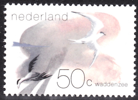 In der Ausgabe "Wattenmeer" ist in den Niederlande diese Marke (MiNr 1209) erschienen. Im Markenbild ist rechts eine Brandseeschwalbe (Thalasseus sandvicensis) im Flug zu sehen.
