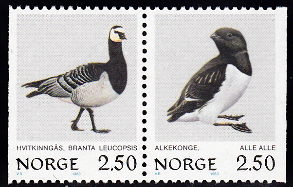 Auf dieser Marke aus Norwegen (MiNr 883) ist eine Weißwangengans (Branta leucopsis) abgebildet.
