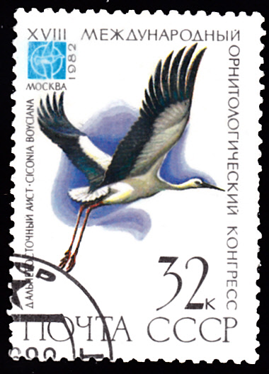In einer Serie der Sowjetunion zur Internationalen Konferenz der Ornithologen in Moskau erschien eine Marke (MiNr 5186)mit einem Schwarzschnabelstorch (Ciconia boyciana).