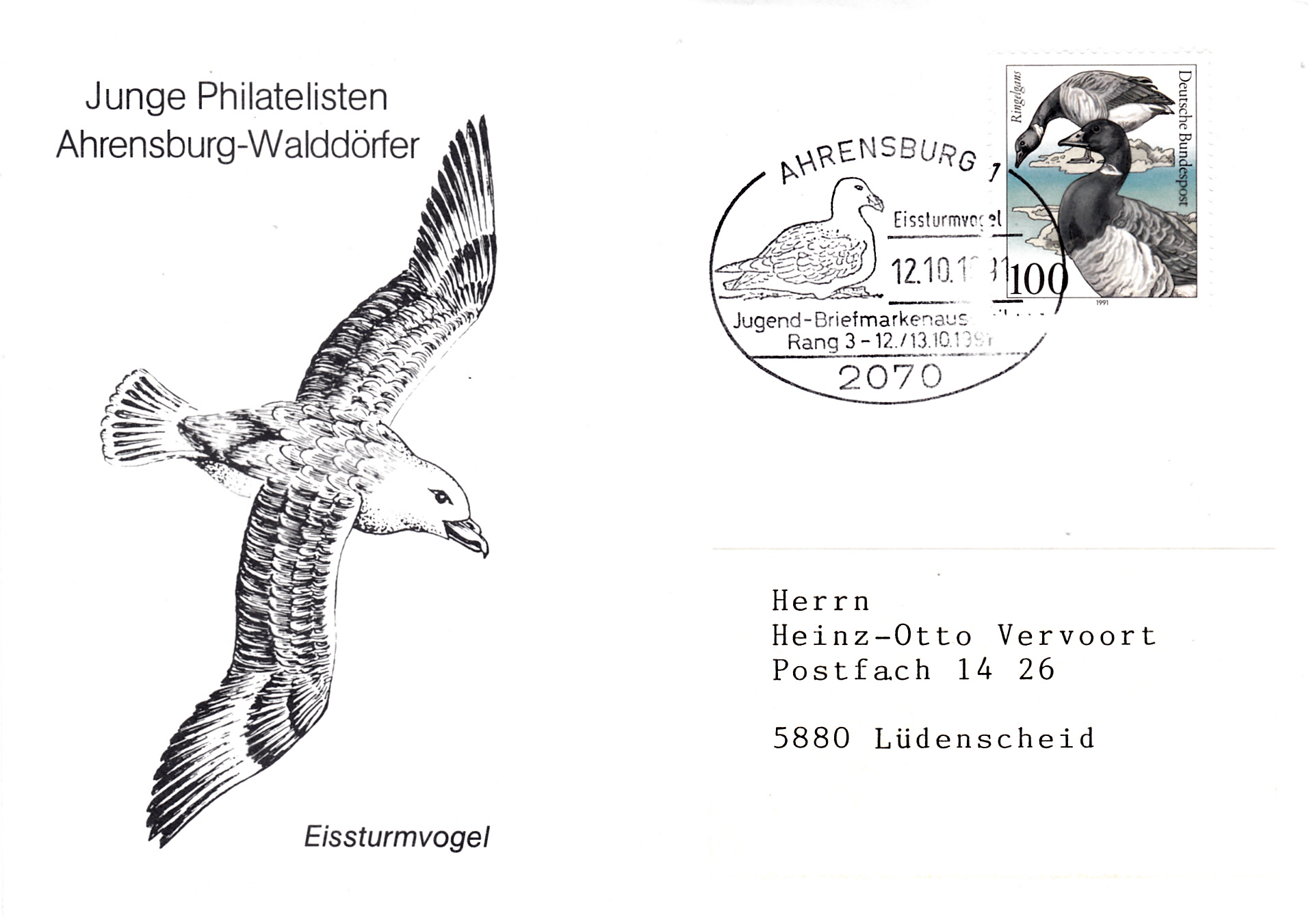 Im Sonderstempel vom 12.10.1981 aus Ahrensburg zu einer Jugendbriefmarkenausstellung wird ein Eissturmvogel (Fulmarus glacialis)n gezeigt.