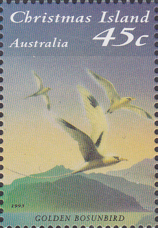 Eine Marke der Weihnachtsinsel (MiNr 382) bildet Weihnachtsinsel-Weißschwanztropikvögel (Phaeton lepturus fulvus) im Flug ab.