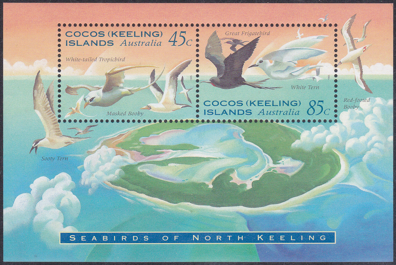 Auf einer Marke der Kokos-Inseln (MiNr 333) wird auf der rechten Markenseite eine Feenseeschwalbe (Gygis alba) abgebildet.
