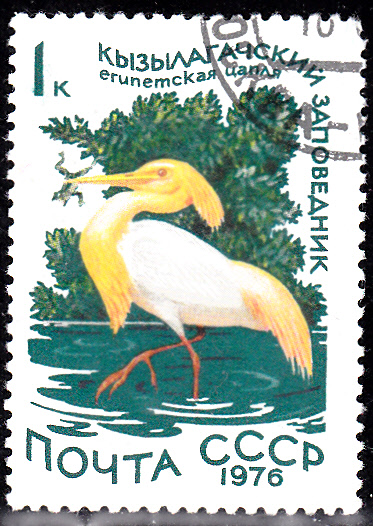 Auf dieser Marke der Sowjetunion wird ein Kuhreiher (Bubulcus ibis) abgebildet.