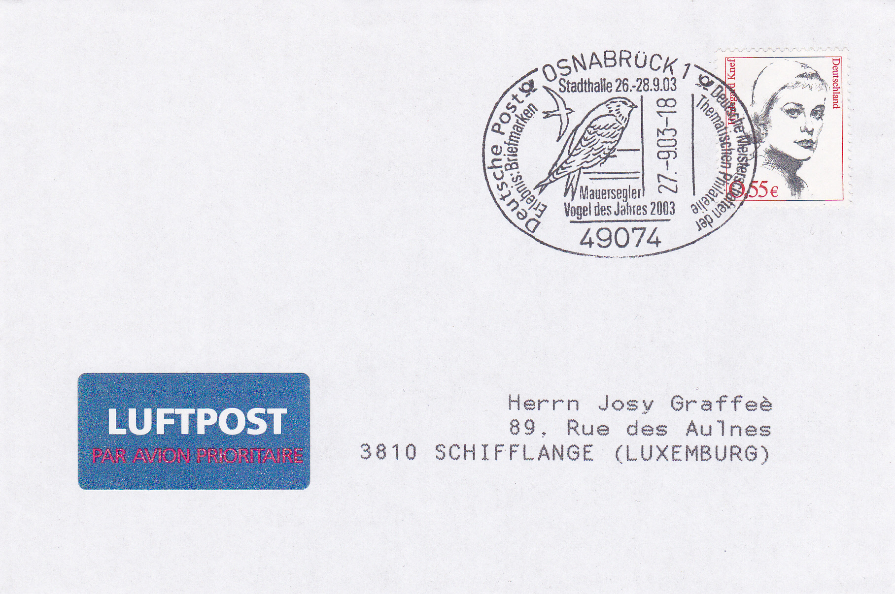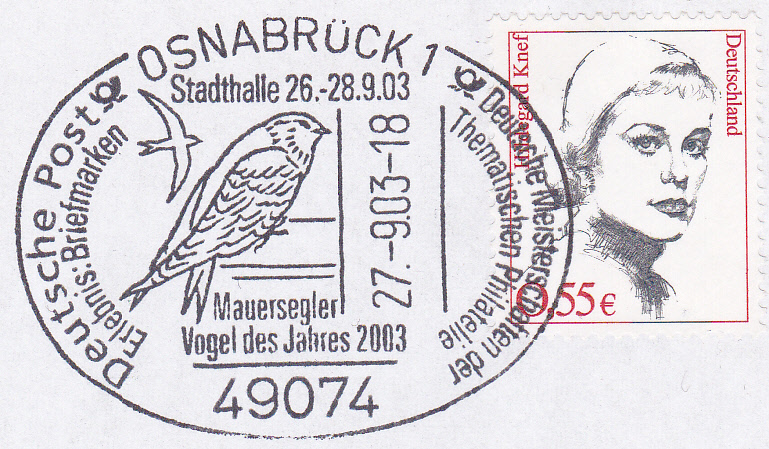Im Sonderstempel vom 27.9.2003 aus Osnabrück wird darauf hingewiesen und ein je Mauersegler sitzend und fliegend gezeigt.