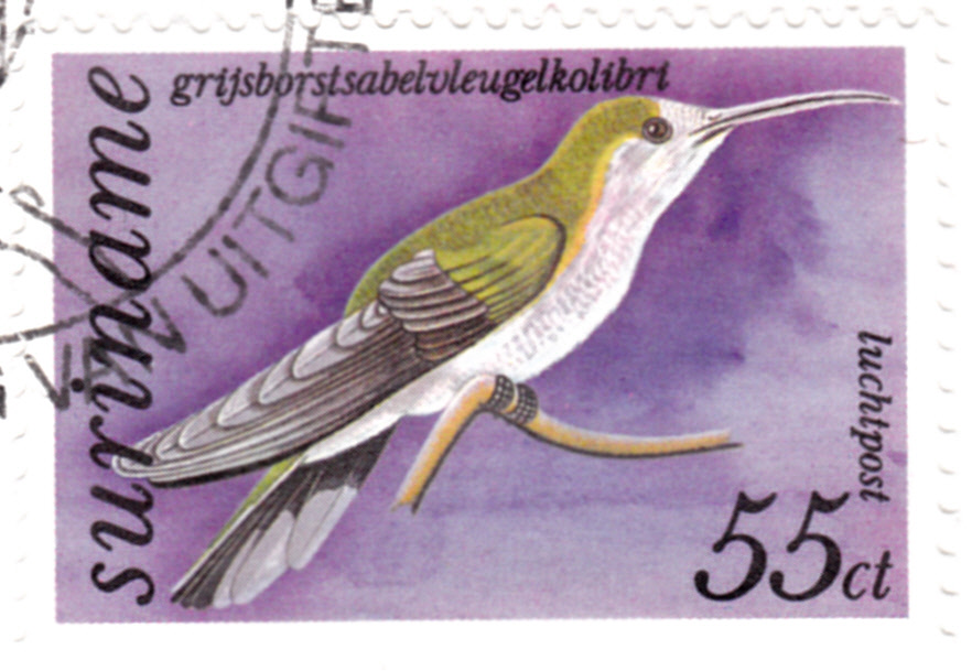 Auf dieser Marke aus Surinam (MiNr 784) ist ein Graubrust-Degenflügel (Campylopterus largipennis) zu sehen. Michel nennt ihn Säbelflügler (Campylopterus largipennis).