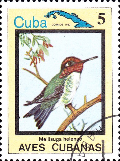 Diese Marke aus Kuba (MiNr 2798) zeigt eine weitere Bienenelfe (Mellisuga helenae). Michel nennt hier als Name Hummelkolibri (Calypte helenae).