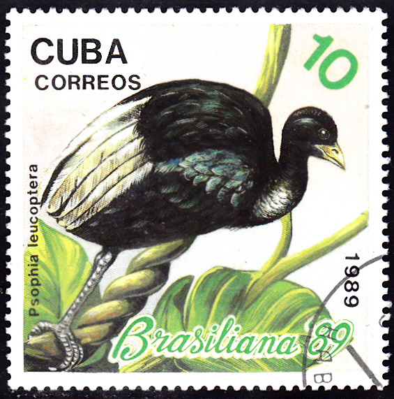 Auf einer Marke aus Kuba wird ein Weißflügel-Trompetervogel (Psophia leucoptera) gezeigt. Bei Michel wird als Name Weißrücken-Trompetervogel (Psophia leucoptera) genannt.