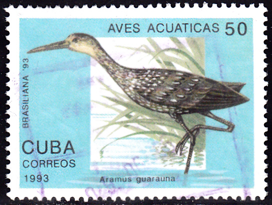 Eine Marke aus Kuba (MiNr 3688) bildet einen Rallenkranich (Aramus guarauna) ab. Michel nennt als Name Riesenkranich (Aramus guarauna).