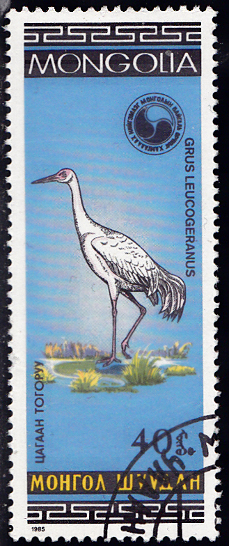 Einen weiteren Nonnenkranich (Grus leucogeranus) zeigt diese Marke aus der Mongolei (MiNr 1701)