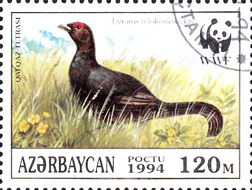 Aus Aserbaidschan kommt diese Marke (MiNr 161) mit einer Henne des Kaukasus-Birkhuhn (Lyrurus mlokosiewiczi) beim Brüten.